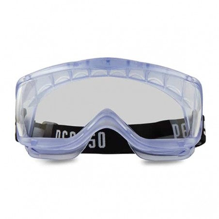 Gafa de seguridad antilíquidos. Montura integral con gran visión panorámica. Frontal sobreinyectado en goma antideslizante. Su diseño está pensado especialmente para permitir indistintamente su uso sobre gafas correctoras o sin ellas.